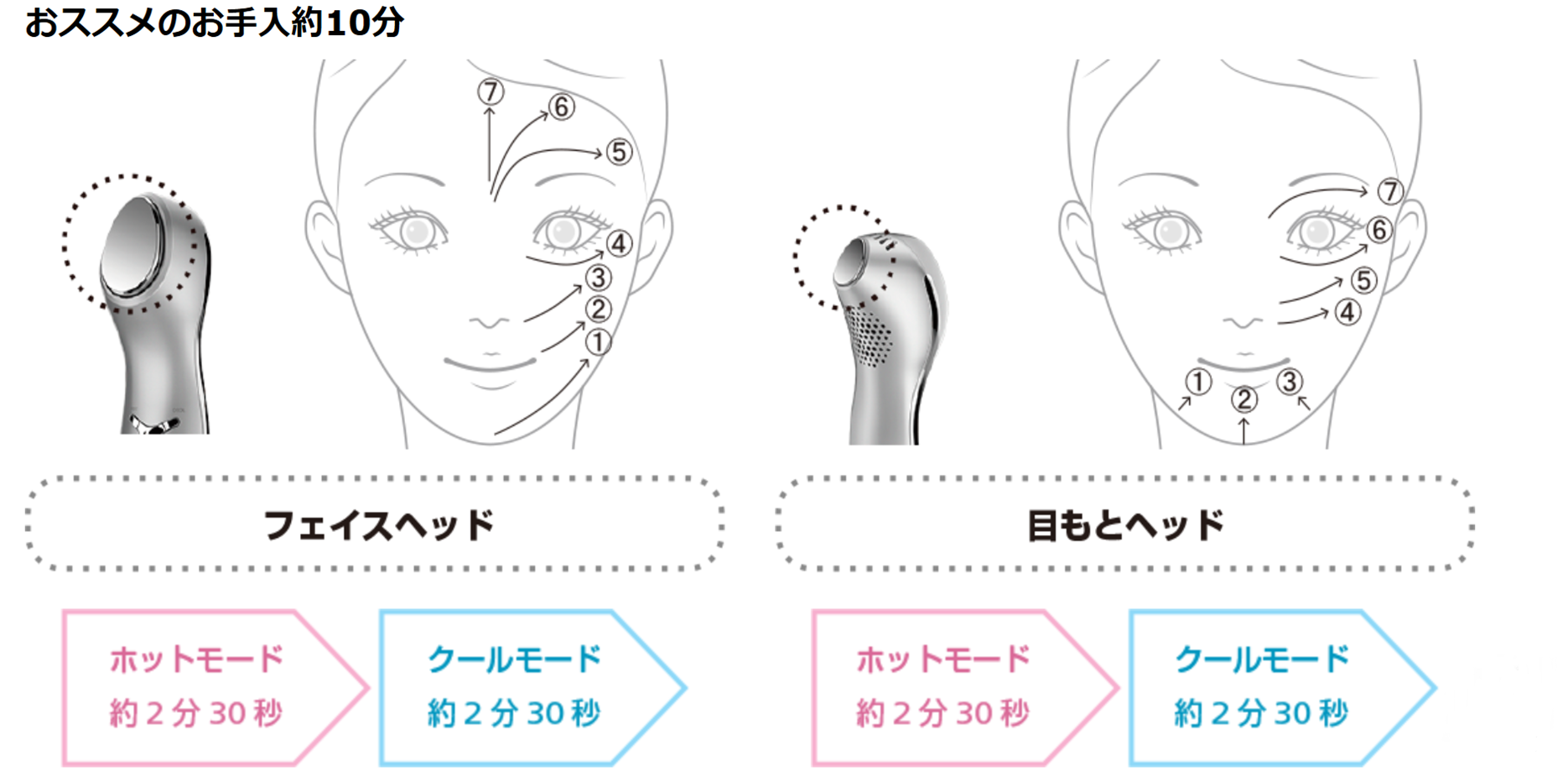 冷却ケアで美容成分をとじこめ、お肌をキュッと引締めます。 フェイスヘッド、目もとヘッド 約10℃ ※ヘッドは一箇所に当て続けないでください。 |